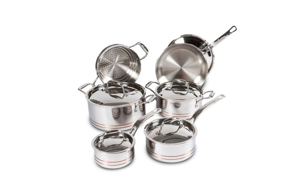 This 11-piece copper cookware set is built of ultra-resilient stainless-steel bodies and handles for durability, combined with the best in heat conduction: aluminum and copper. The unique 5-ply construction contains a heat-responsive copper core between aluminum layers, for precise temperature control and unsurpassed heat retention. The beautiful copper pots and pans sets detailing means you will want to take this cookware from the stovetop to the table to show off your cooked foods in style. Speaking of stovetops, each piece is compatible with all types of cooking surfaces, including induction. Plus, this timeless copper cookware set is guaranteed for life.